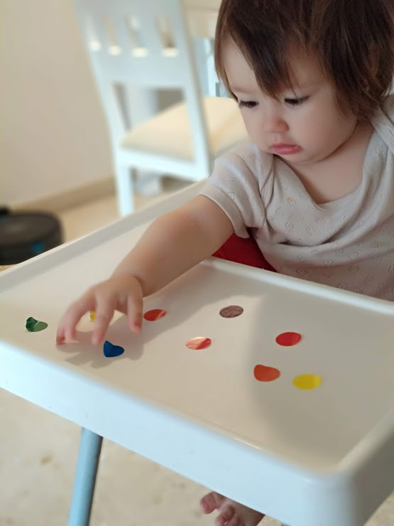 Con pegatinas de colores y en la misma bandeja de la trona prepararemos una actividad sencilla.